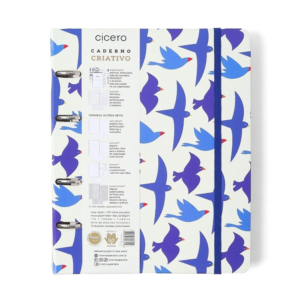 Este ícone da organização e de sucesso da Cicero tem capa dura com cantos arredondados, elástico para fechamento e ferragem prata com 4 furos. Confira todos os refis disponíveis para somar na sua organização, cada um com um uso específico: fichas pautadas, folhas quadriculadas, pontadas, pautadas e sem pauta, folhas com linhas brancas e divisórias com folha de adesivo.