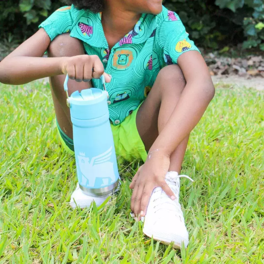 A Flip Straw Kids é térmica, possui alça para transporte, trava anti-vazamento em sua tampa, canudo de bico rígido retrátil, além do design ergonômico perfeito para mãos pequenas.