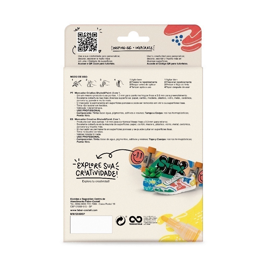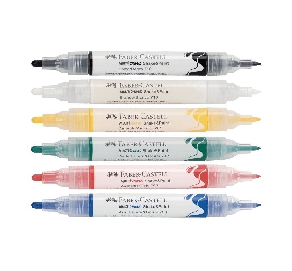 A linha de marcadores criativos MultiMark Faber-Castell, é a combinação perfeita para jovens, entusiastas ou amantes da arte, que buscam um produto de design moderno, simples e prático, capaz de dar asas a imaginação em uma infinidade de superfícies. É possível customizar peças e acessórios, criando obras únicas de forma rápida e fácil. Feito com os mais altos padrões Faber-Castell e qualidade excepcional em todos os componentes. As tintas são miscíveis (proporcionando uma cartela extensa de cores e técnicas), a base é água, elaborada com pigmentos para assim garantir uma cobertura superior e as pontas estruturadas para grande durabilidade e proporcionar firmeza na utilização (2 em 1, duas pontas, 1.0mm para traços finos e detalhes / 3.0mm ponta versátil e ideal para preenchimento). Especificações: Marcador Base Água. Multisuperfície. Mechanismo Shake&Pump. Duas Pontas: 1.0mm e 3.0mm. Ideal para artesanato. Perfeito para customização e personalização.